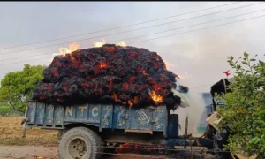नैनीताल जिले के अंतर्गत बिंदुखत्ता में एक खेत से दूसरे खेत में ट्रैक्टर ट्राली द्वारा गेहूं की फसल ले जाते समय रास्ते...