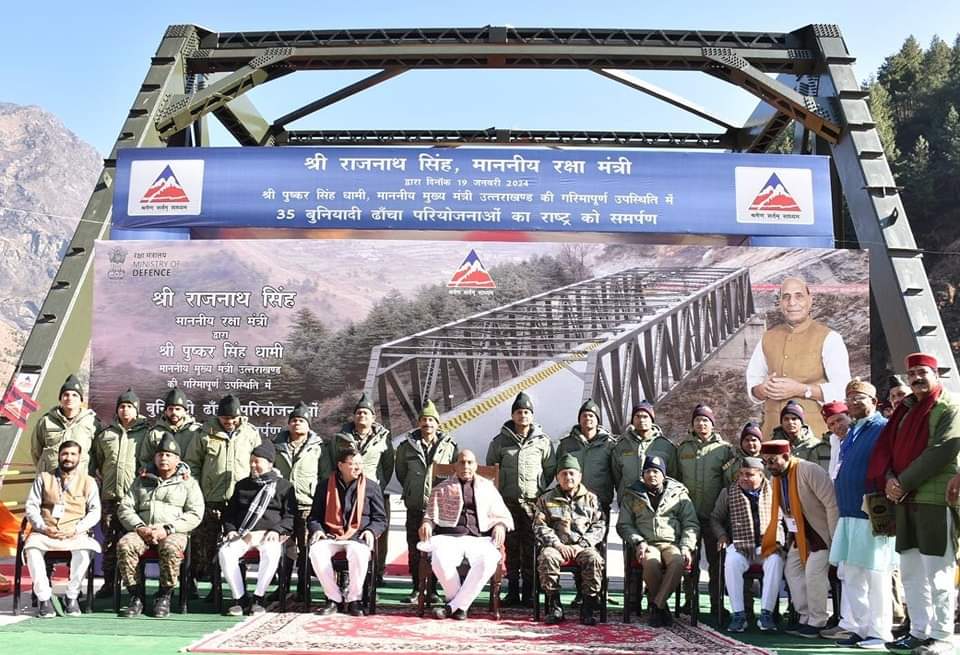 रक्षा मंत्री राजनाथ सिंह ने 19 जनवरी को सीमांत क्षेत्र जोशीमठ ढाक से बीआरओ द्वारा निर्मित 35 इंफ्रास्ट्रक्चर परियोजनाओं का उद्घाटन करते हुए देश को समर्पित किया। इसमें सात राज्यों की 06 सड़कें और 29 ब्रिज शामिल है। परियोजनाओं को बीआरओ द्वारा 670 करोड़ की लागत पर पूरा किया गया। इस दौरान प्रदेश के मुख्यमंत्री श्री पुष्कर सिंह धामी और गढवाल सांसद श्री तीरथ सिंह रावत रक्षामंत्री के साथ मौजूद रहे। रक्षा मंत्री ने सात राज्यों की जिन परियोजनाओं का उद्घाटन किया उनमें उत्तराखंड में 03 ब्रिज, जम्मू-कश्मीर में 01 सड़क व 10 ब्रिज, लद्वाख में 03 सड़के व 6 ब्रिज, हिमांचल प्रदेश में 01 ब्रिज, सिक्किम में 02 सडकें, अरूणाचल प्रदेश में 08 ब्रिज तथा मिजोरम में 01 ब्रिज शामिल है। उत्तराखंड राज्य में भारत चीन सीमा को जोड़ने वाले जोशमठ-मलारी मार्ग पर ढाक ब्रिज एवं भापकुंड ब्रिज और सुमना-रिमखिम मोटर मार्ग पर रिमखिम गाढ ब्रिज को शिवालित परियोजना द्वारा 33.24 करोड़ लागत से तीनों ब्रिज बनाए गए है। जिससे सीमांत क्षेत्रों में आवागमन सुगम हो गया है।