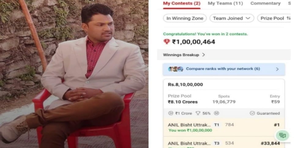 लेकिन अब अनिल सिंह बिष्ट करोड़पति बन गए हैं अनिल सिंह बिष्ट ने ड्रीम 11 पर यूएई टी 20 मैच में अपनी टीम बनाई थी और उनकी टीम पहले स्थान पर आई और वो 1 करोड़ रुपए जीत गए।आपको बता दे अनिल सिंह बिष्ट अब तक 9846 कॉन्टेस्ट खेल चुके है जिसमे वो 3 लाख 50 हजार रुपए की एंट्री फीस लगा कर गवां भी चुके है। लेकिन अब उनको सफलता मिली और वो ड्रीम 11 में टीम बनाकर 1 करोड़ रुपए जीत गए हैं।